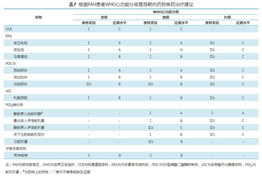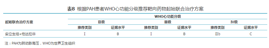推荐意见:根据PAH患者WHO心功能分级推荐的单药治疗、起始联合治疗方案分别见表7、表8,对WHO心功能Ⅳ级的患者,建议先给予以静脉或皮下前列环素为基础的联合治疗至少3个月,仍然疗效不佳时可考虑肺移植或心肺联合移植。序贯联合治疗方案应根据患者具体情况选择。