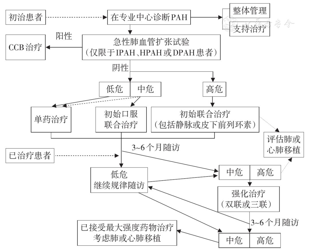 PAH:肺动脉高压,CCB:钙通道阻滞剂,IPAH:特发性肺动脉高压,HPAH:遗传性肺动脉高压,DPAH:药物相关肺动脉高压;实线为明确推荐,虚线为可选推荐