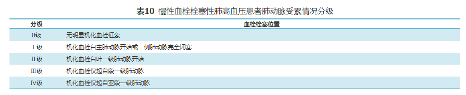 CTEPH的诊断标准[179,180]:充分抗凝治疗至少3个月;CT肺动脉造影或肺通气灌注显像或直接肺动脉造影提示存在肺栓塞征象;右心导管测定肺循环血流动力学参数符合PAH诊断标准,以上3个标准须同时满足。CTEPH的治疗方法主要包括肺动脉内膜剥脱术、药物治疗和球囊肺动脉成形术。根据CTEPH患者肺动脉受累情况分级(表10),Ⅰ、Ⅱ级的患者优选肺动脉内膜剥脱术,而Ⅲ、Ⅳ级的患者则优选肺动脉球囊成形术,但也应根据具体临床情况选择合适的治疗策略。