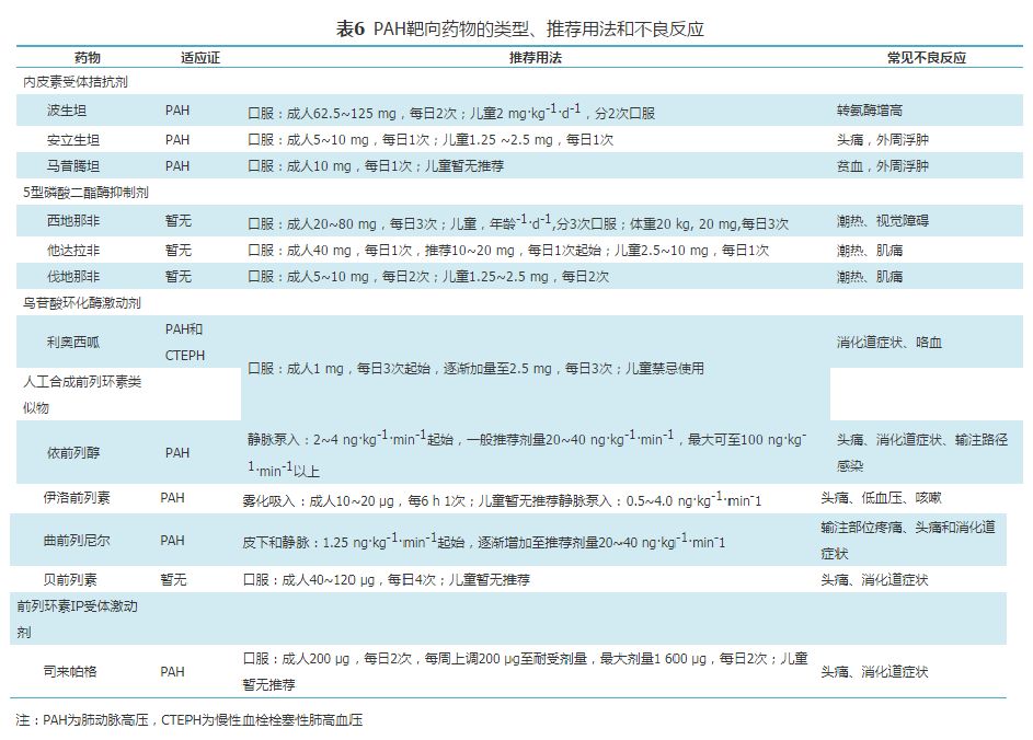 肺动脉高压靶向药物的类型、推荐用法和不良反应见表6,治疗流程见图2。