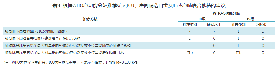 对重症PAH患者重症监护和房间隔造口术及肺移植治疗的建议详见表9。