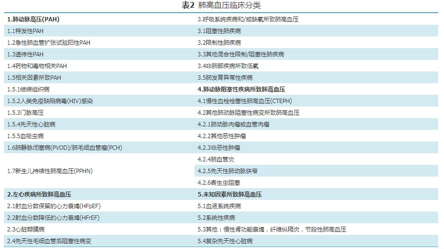 本指南推荐的肺高血压临床分类仍延续既往五大类分类原则,并参照2018年第6届世界肺高血压大会贼新内容进行修订,详见表2。