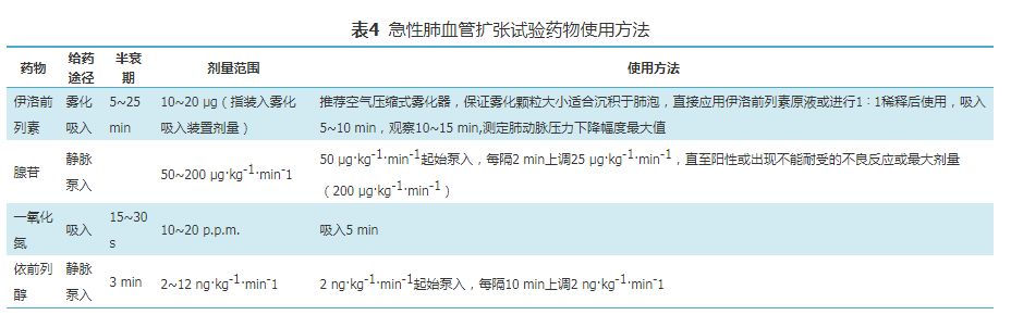 急性肺血管扩张试验药物与方法:用于试验的药物均为起效迅速、半衰期短的选择性肺血管扩张药物,包括吸入伊洛前列素[56]、静脉泵入腺苷[57]、吸入NO或静脉泵入依前列醇。现在国内主要应用吸入用伊洛前列素(商品名:万他维)和腺苷(商品名:艾朵)进行检查。具体使用方法见表4。